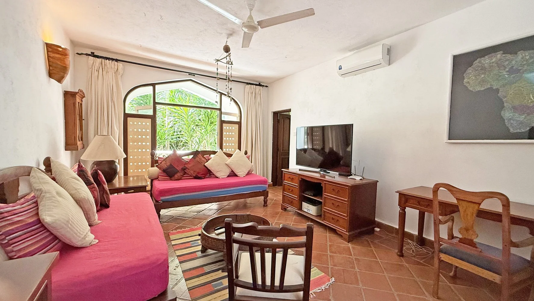 For moments when the children need to escape the heat of the Kenyan sun, there is also a comfortable TV room off to one side β air-conditioned, with soft sofas and a small desk for anyone who needs to catch up on a bit of work.