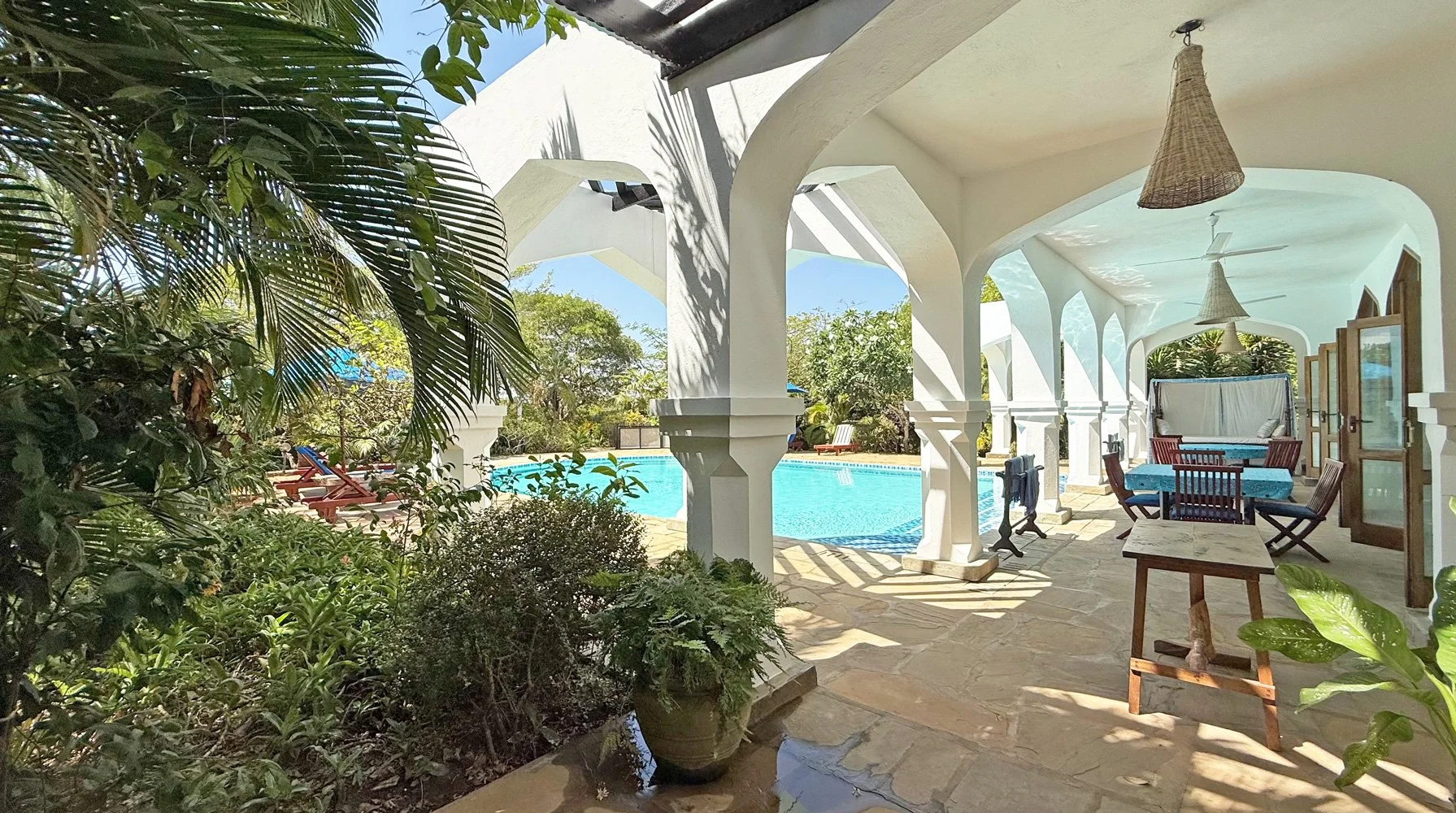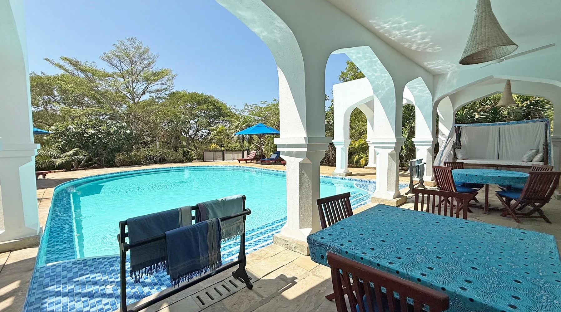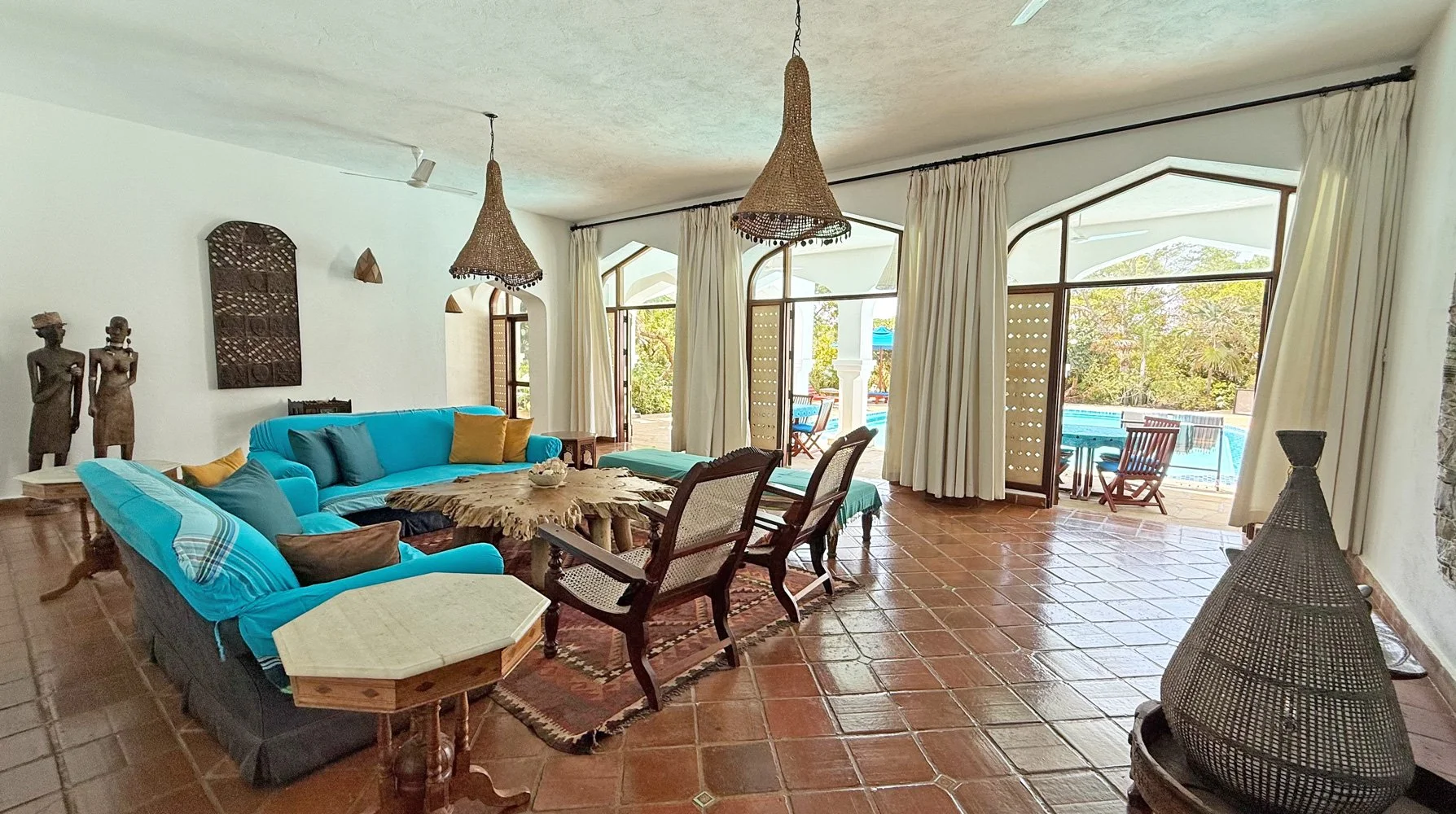 A magnificent entrance leads through to the house and into a spacious, light-filled living area that opens out onto a covered terrace overlooking and gently bordering the inviting swimming pool. There are plenty of spaces to relax and drink in the atmosphere. The property is just a short, pleasant walk from both the main beach at Watamu Marine Park and the quieter Short Beach that overlooks the scenic mouth of Mida Creek.