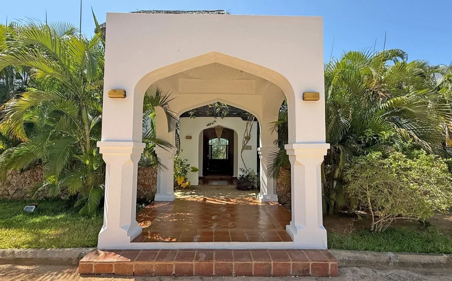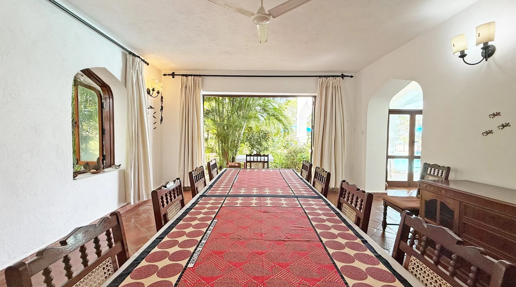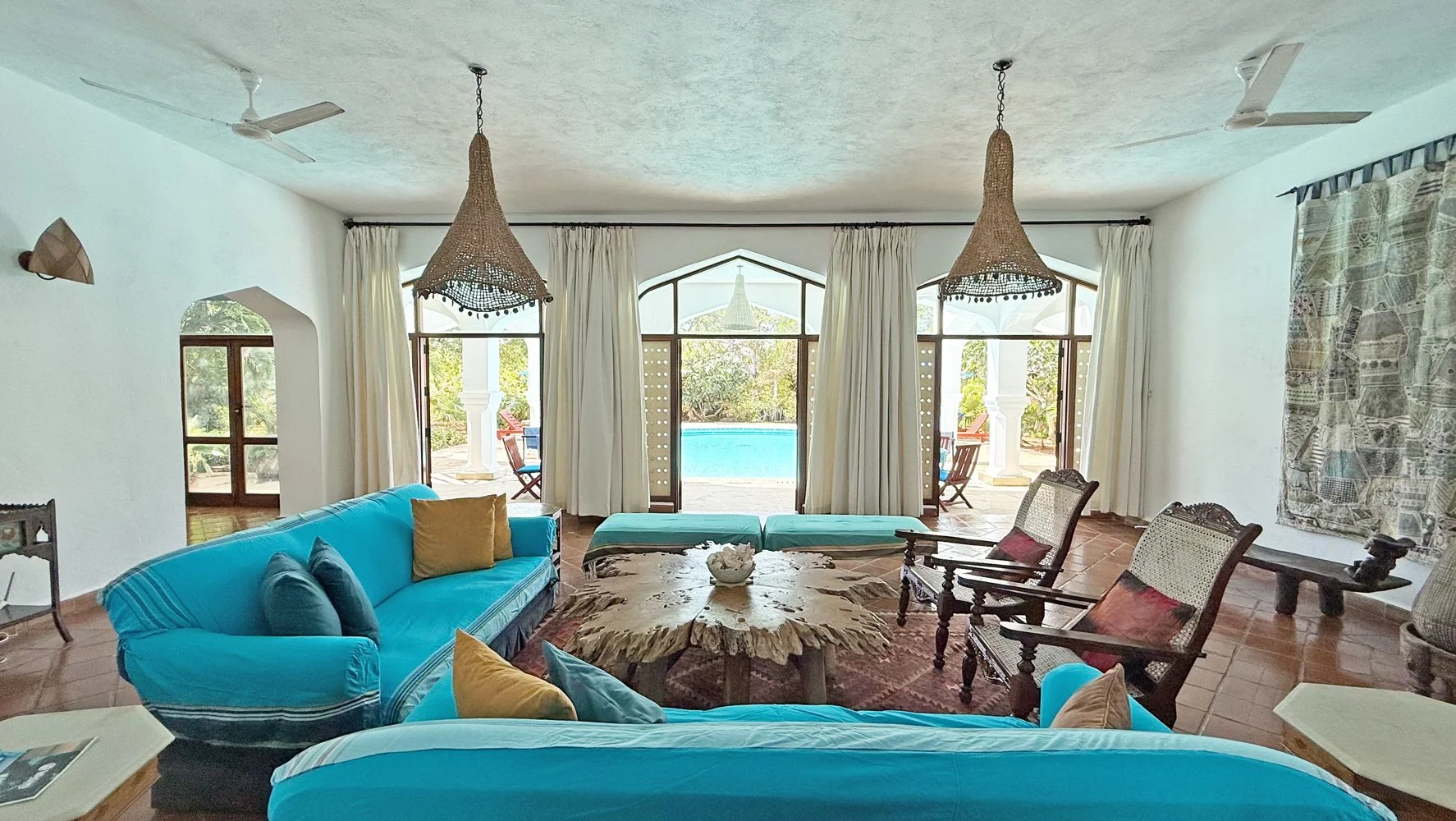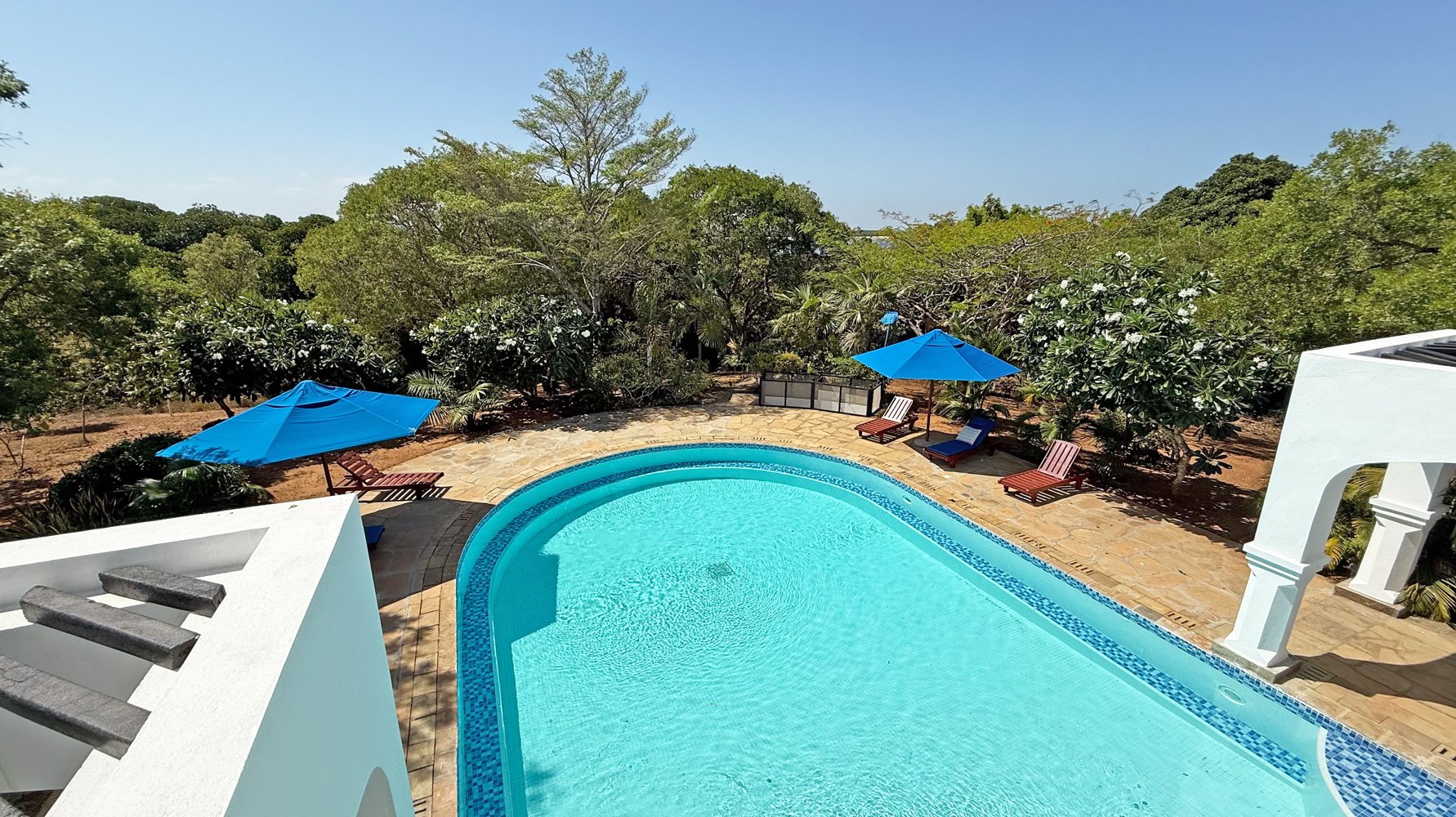 A magnificent entrance leads through to the house and into a spacious, light-filled living area that opens out onto a covered terrace overlooking and gently bordering the inviting swimming pool. There are plenty of spaces to relax and drink in the atmosphere. The property is just a short, pleasant walk from both the main beach at Watamu Marine Park and the quieter Short Beach that overlooks the scenic mouth of Mida Creek.