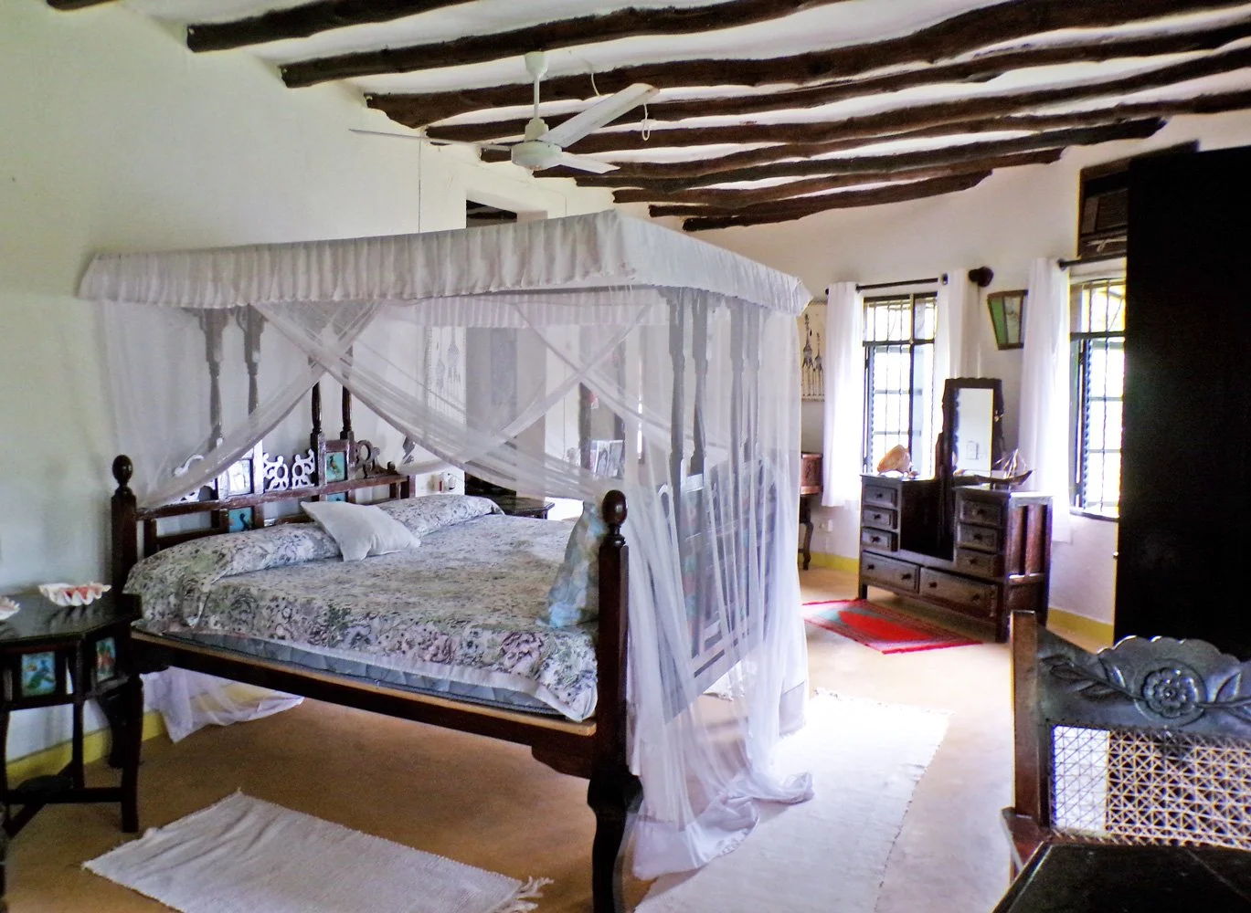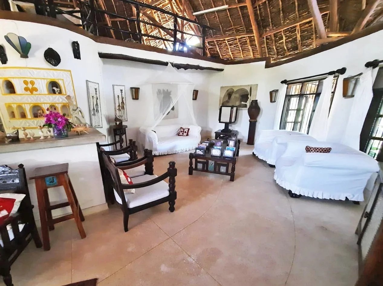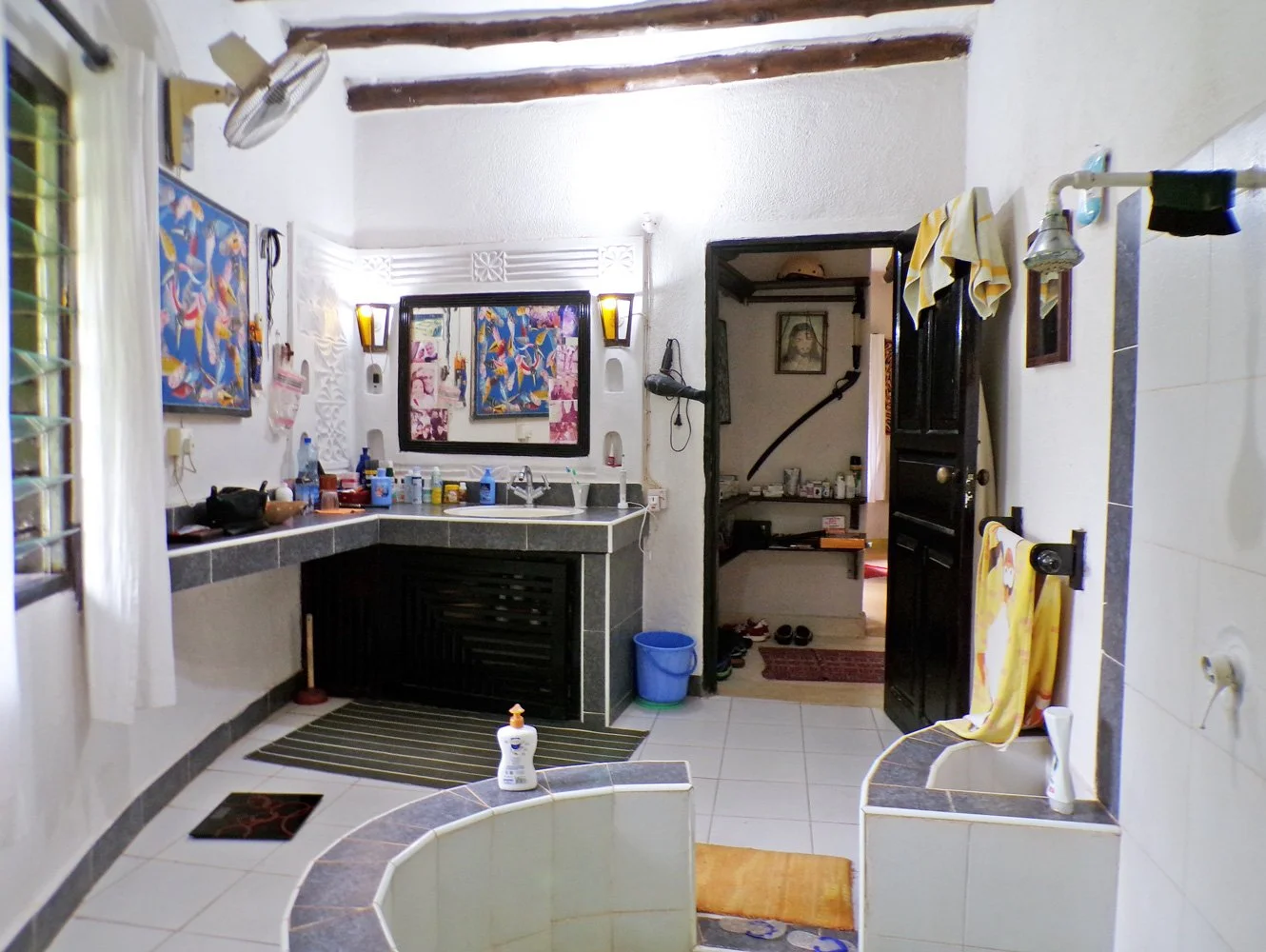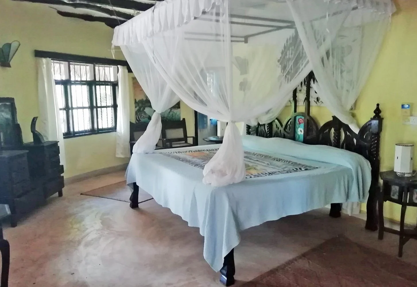 The property features a 2-bedroom domestic quarters, a garage, and a carport for convenient parking. It is being sold unfurnished, but the current contents can either be gifted to the buyer or removed prior to completion, depending on preference. Presently, the contents include essential kitchen appliances such as a fridge, freezer, and oven/stove, as well as a small fridge located in the bar area. There is also a dining table with chairs, complete crockery and cutlery sets, and glassware for entertaining guests. In addition, there are Lamu-style sofas. The guest bedrooms are furnished with two king-size beds and wardrobes, while upstairs features a Lamu-style single bed, a desk and chair, and bookshelves. The master bedroom boasts a king-size bed, a spacious wardrobe, and a large ottoman that doubles as a lockable storage box, providing both comfort and practicality.