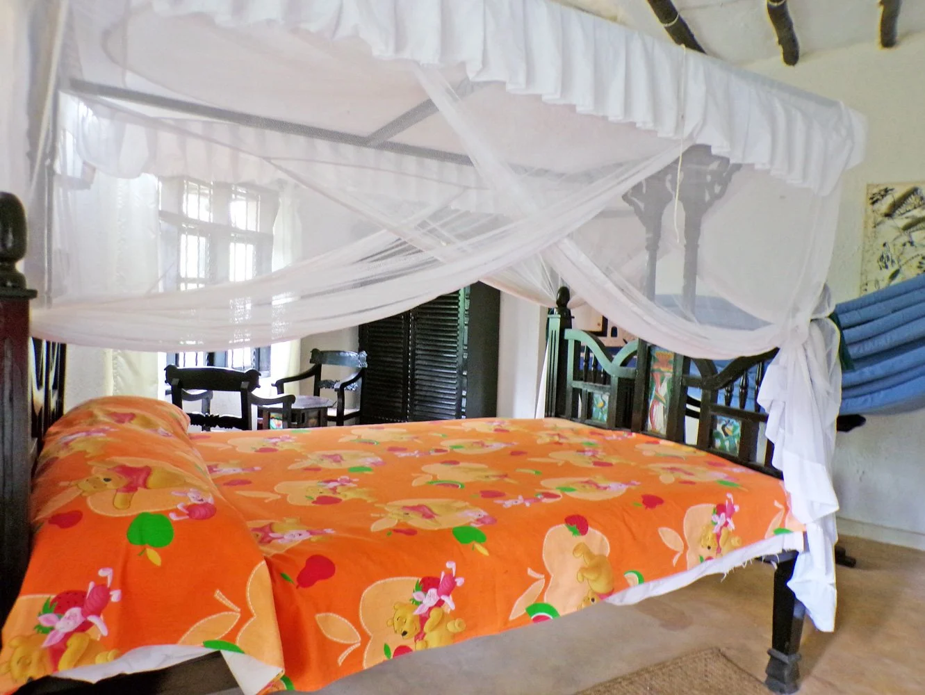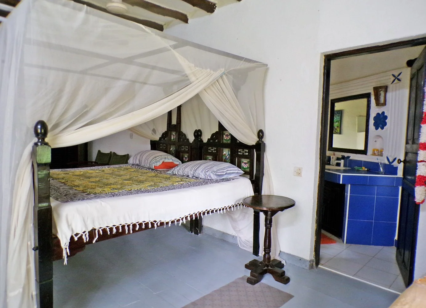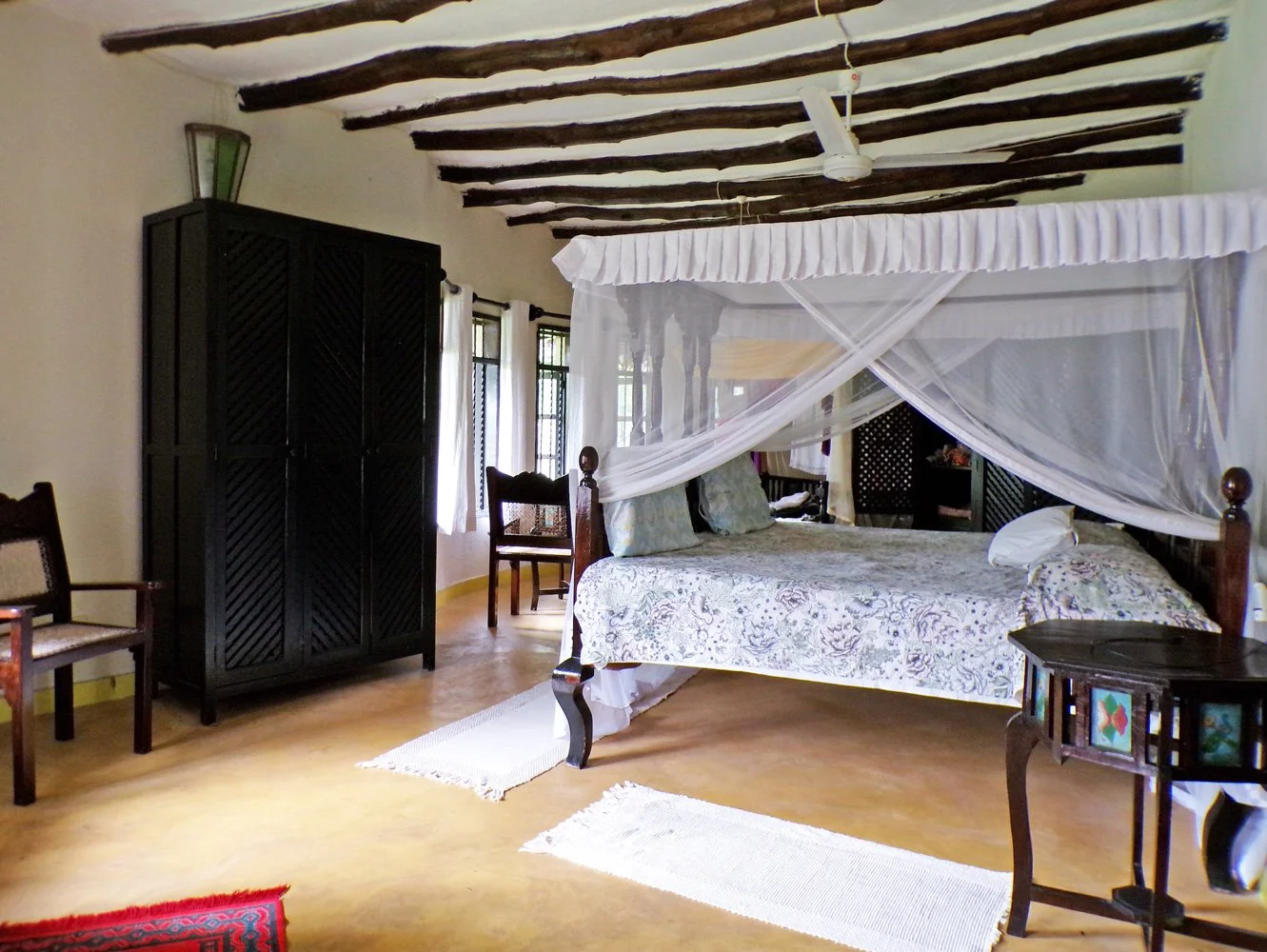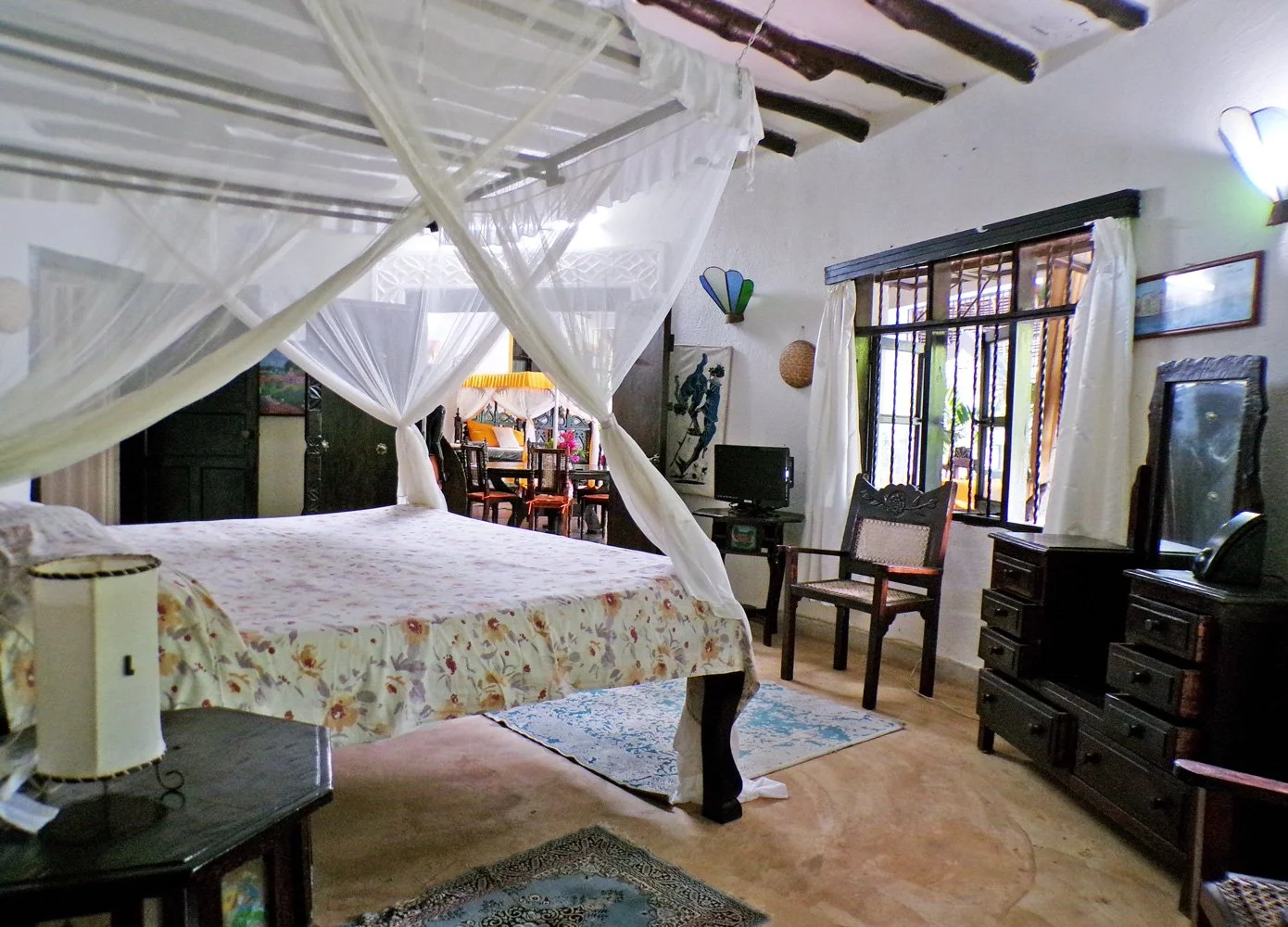 The property features a 2-bedroom domestic quarters, a garage, and a carport for convenient parking. It is being sold unfurnished, but the current contents can either be gifted to the buyer or removed prior to completion, depending on preference. Presently, the contents include essential kitchen appliances such as a fridge, freezer, and oven/stove, as well as a small fridge located in the bar area. There is also a dining table with chairs, complete crockery and cutlery sets, and glassware for entertaining guests. In addition, there are Lamu-style sofas. The guest bedrooms are furnished with two king-size beds and wardrobes, while upstairs features a Lamu-style single bed, a desk and chair, and bookshelves. The master bedroom boasts a king-size bed, a spacious wardrobe, and a large ottoman that doubles as a lockable storage box, providing both comfort and practicality.