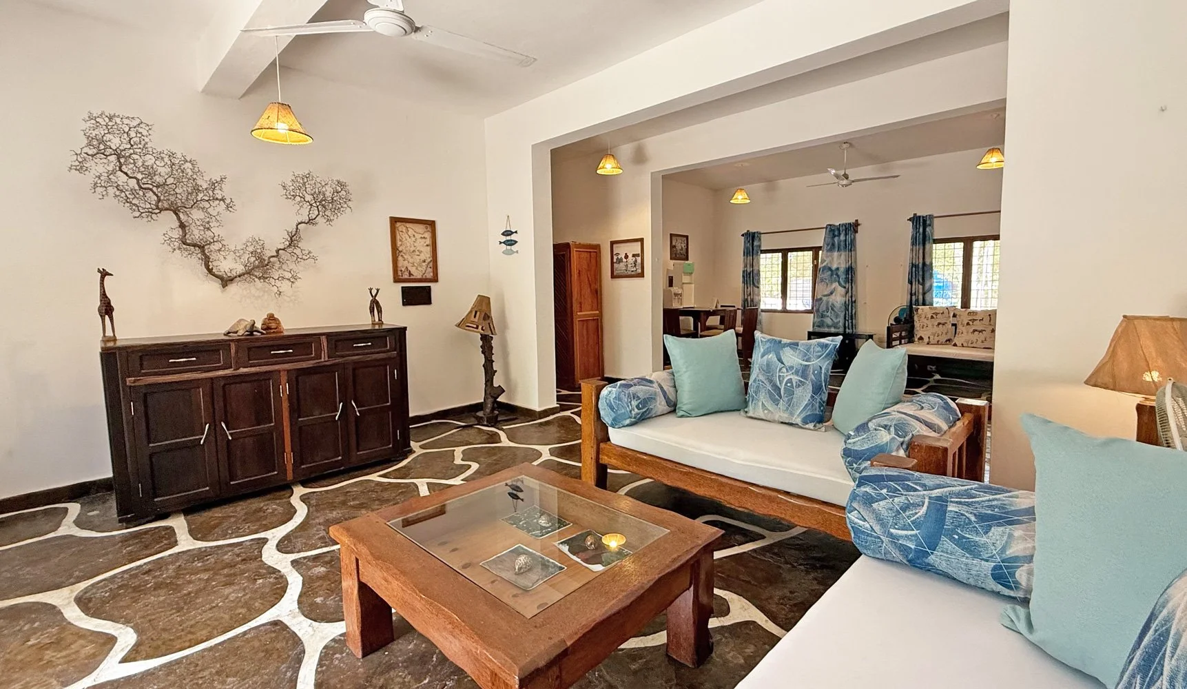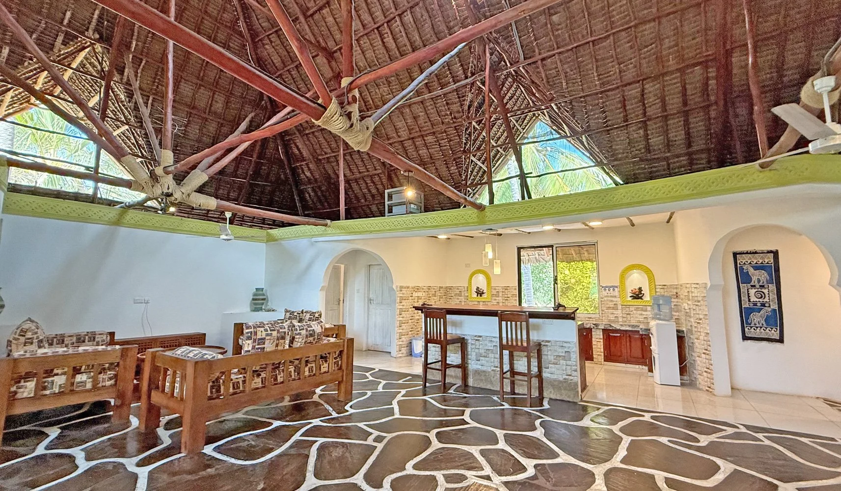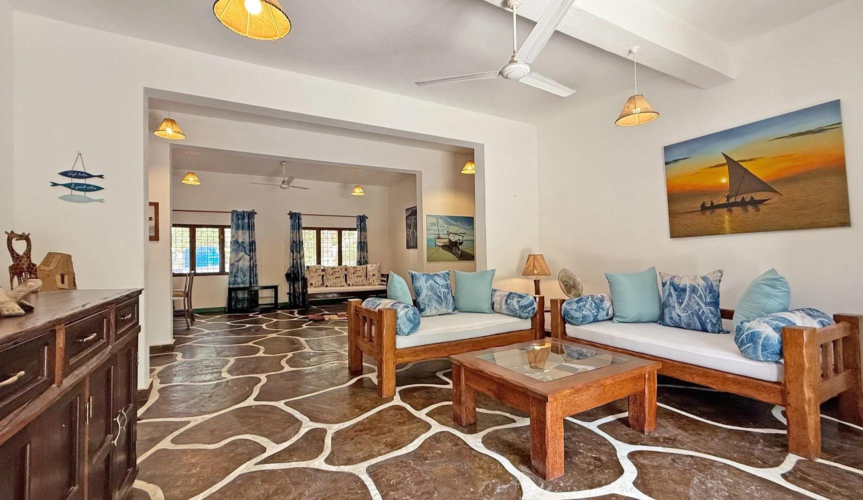 Throughout the house are areas to relax - Inside is a spacious and open plan with a dining area, TV/living area and a kitchen separated with a breakfast bar.