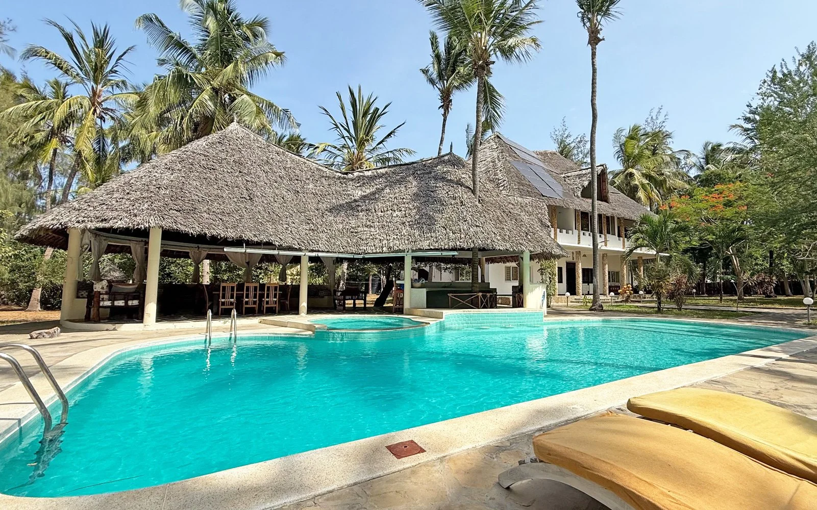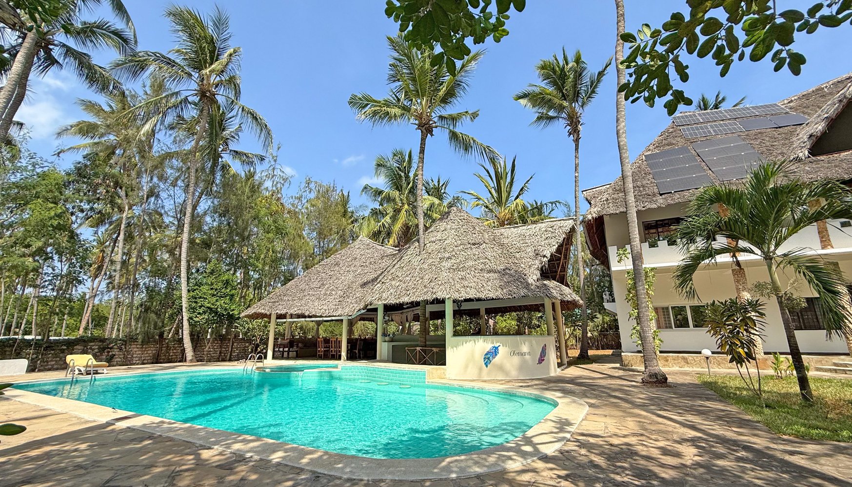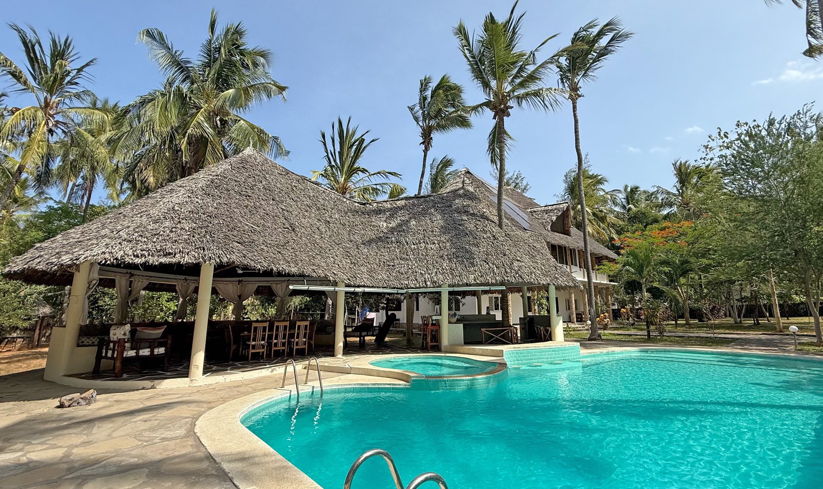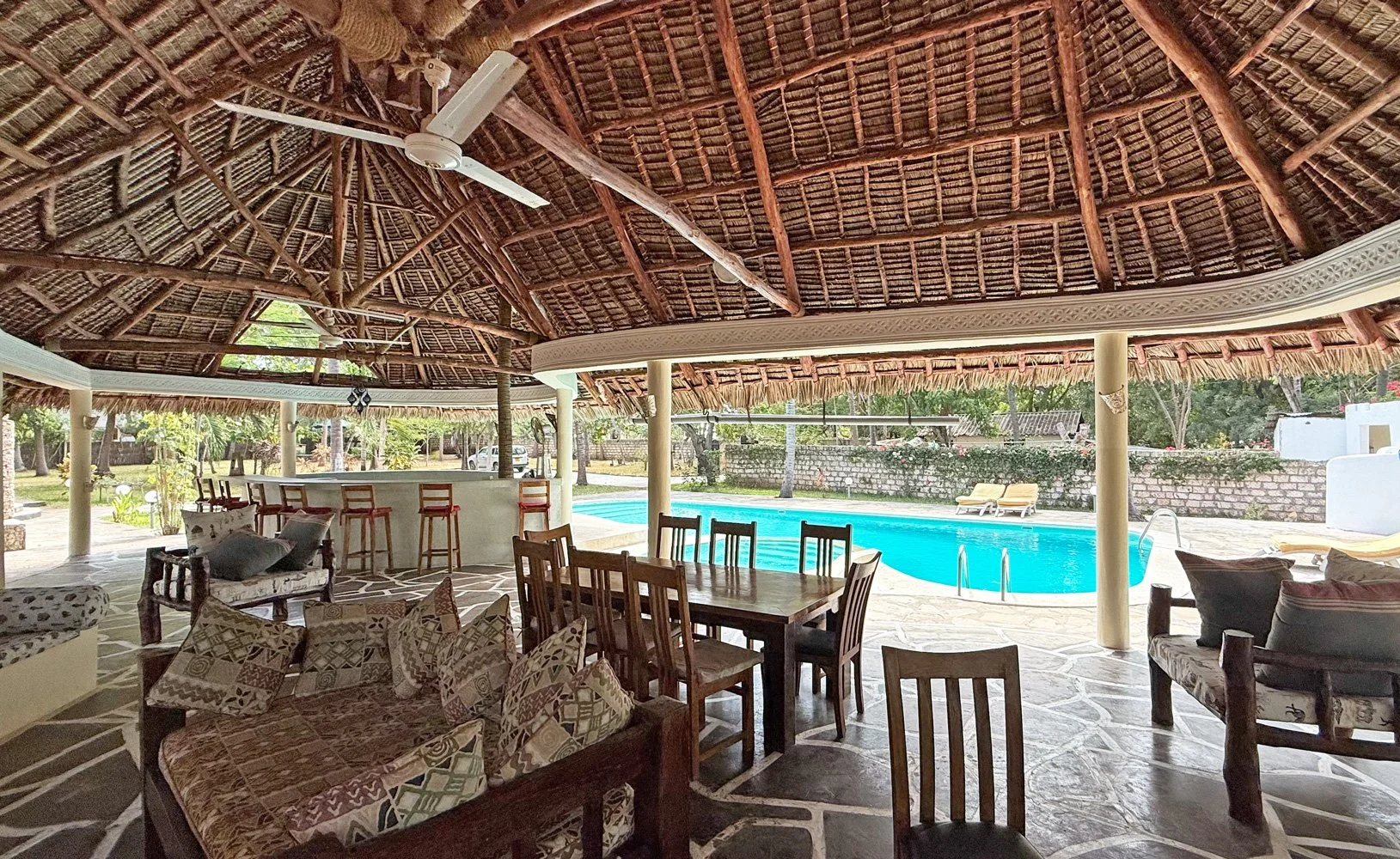 There is a large swimming pool, accompanied by a smaller pool and a lovely shaded living and seating area alongside for relaxing. A swim-up bar provides a refreshing, cooling option during your stay.