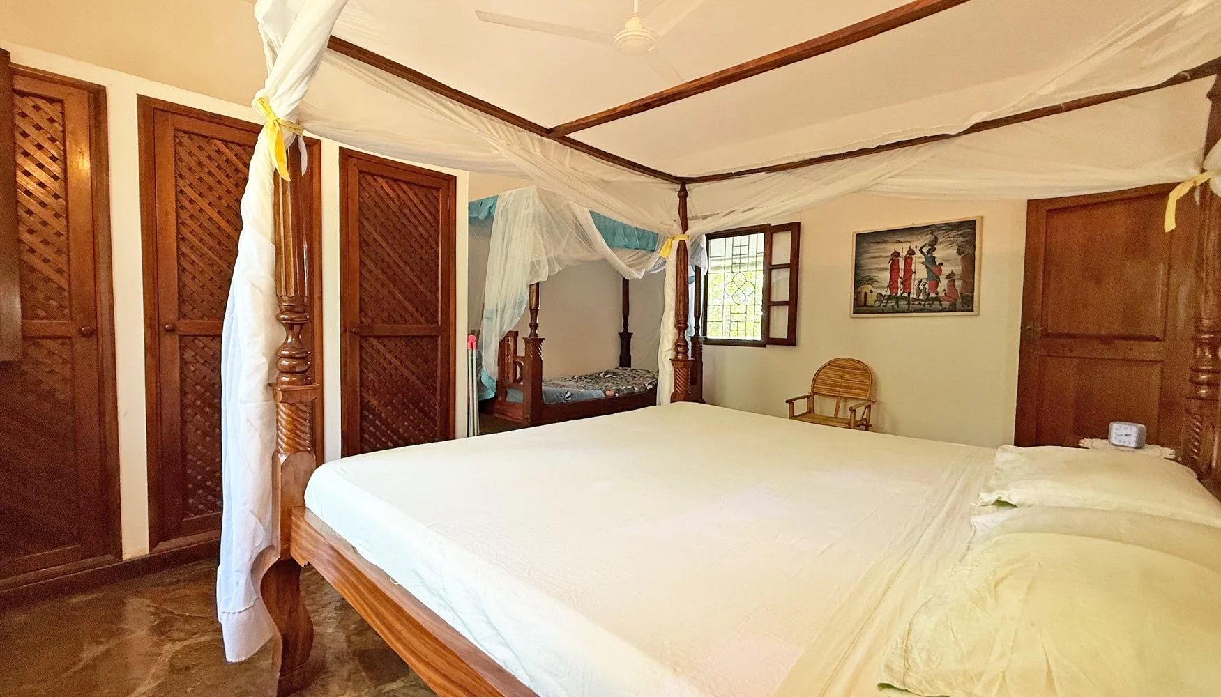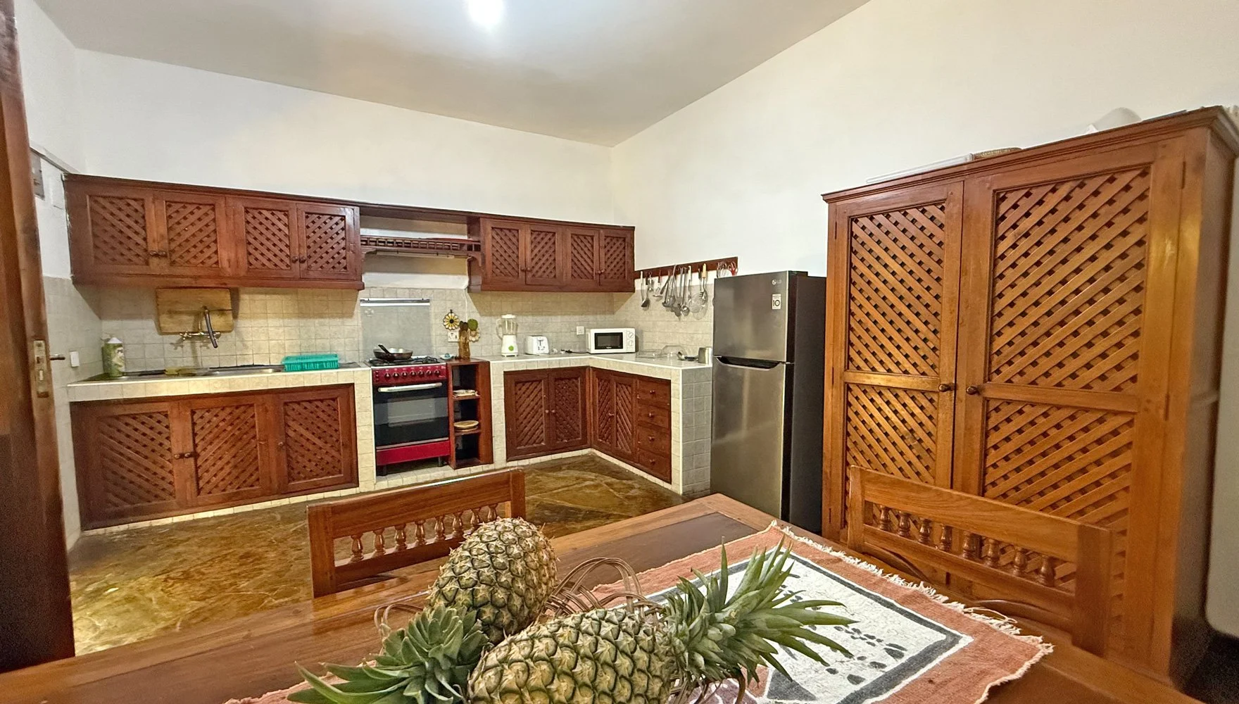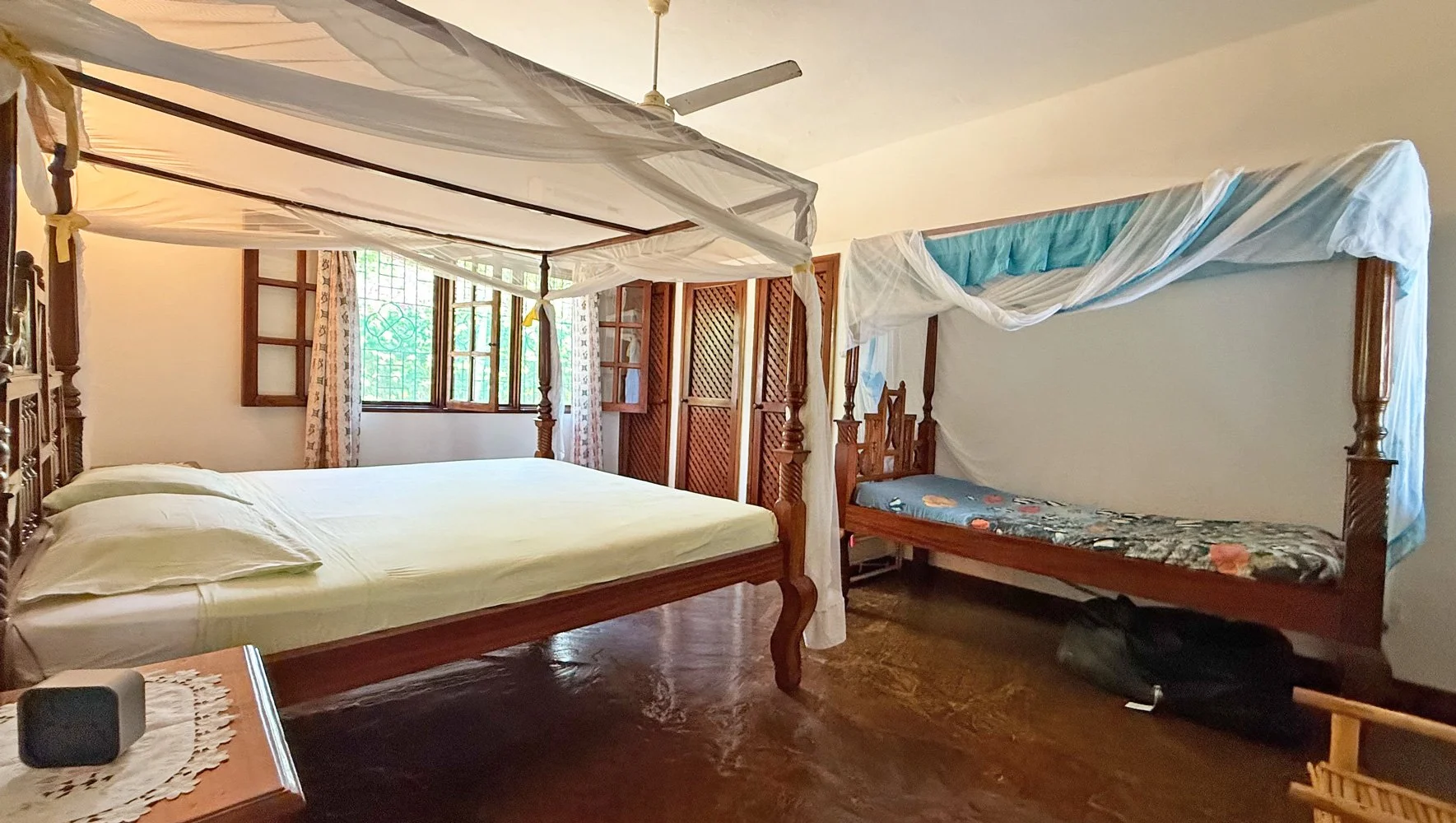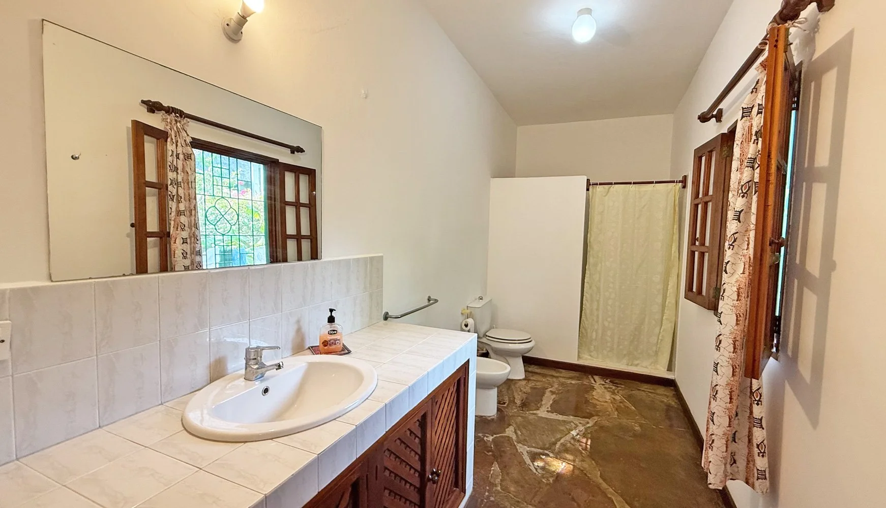 Off the other side of the verandah are the three spacious bedrooms, each comfortably air-conditioned and featuring their own ensuite shower bathroom. Hot water is supplied reliably by electric boilers. The flooring throughout the house is rich Galana stone.