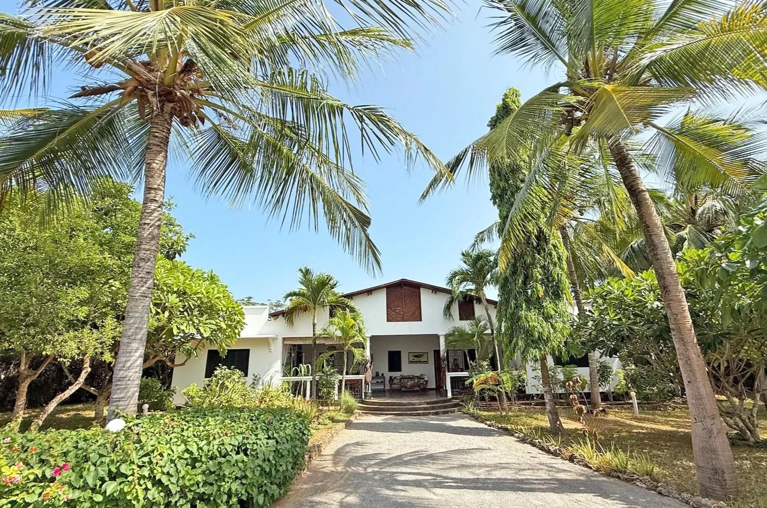 A gently winding path, flanked by swaying palm trees and colourful bedding plants, leads up to the house’s welcoming entrance, where a spacious verandah with a shaded dining area and cosy lounge looks out across the manicured garden — the perfect spot to while away your days, admiring the greenery and enjoying the soft, cooling breeze.