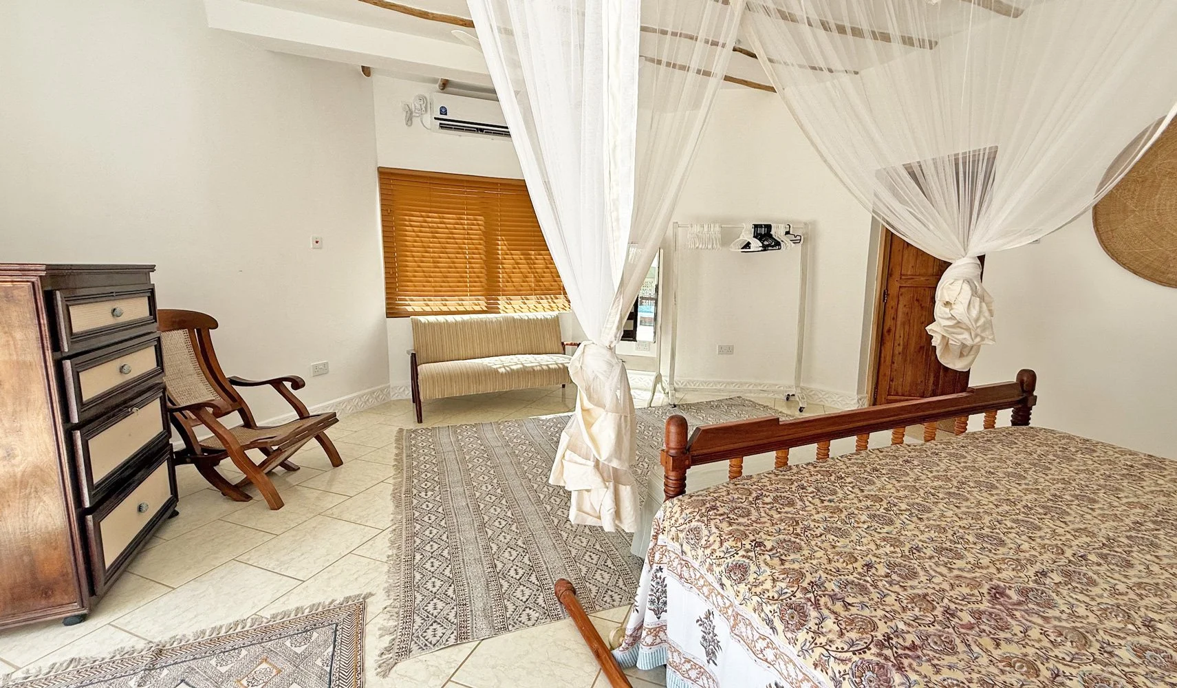 On the upper floor there is a further ensuite double bedroom, also air-conditioned and fitted with a mosquito net and overhead fan, which opens onto a covered private terrace that overlooks the pool.