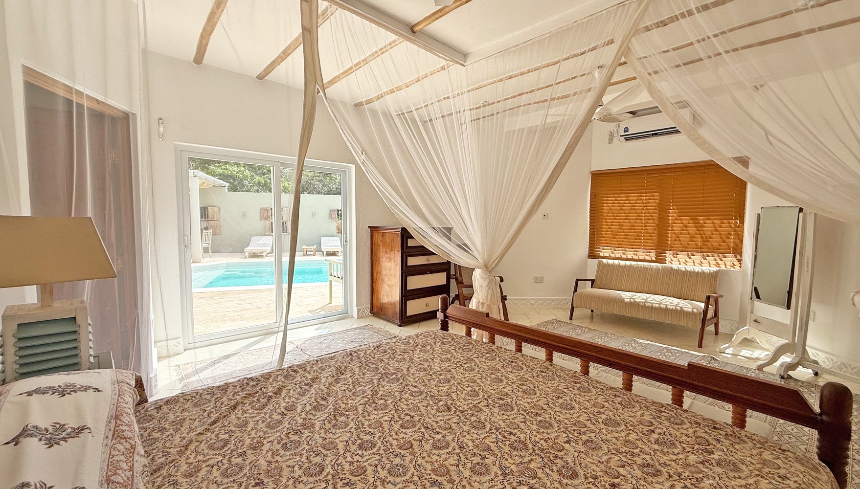 To one side is a beautifully designed double bedroom with a private ensuite bathroom, air-conditioning, fitted mosquito net and doors that opens directly onto the sun-dappled pool terrace.