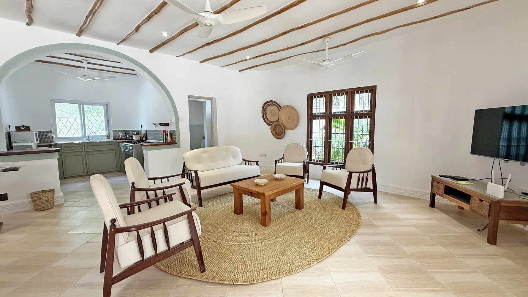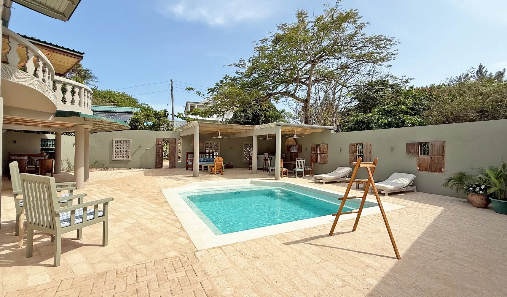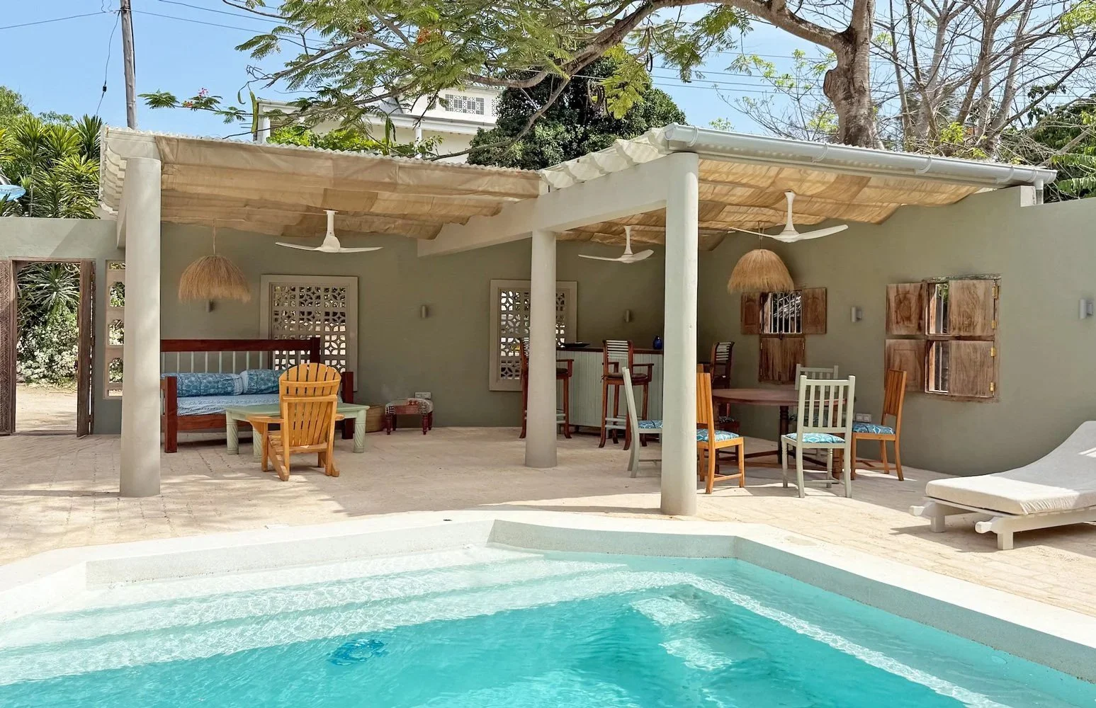 On entering through the Lamu door in the wall you are warmly greeted by an open terrace featuring the lovely pool set into its surface. The pool is bordered by comfortable sunbeds and a covered bar nook in one corner, while the house sits gracefully to the other side. A shaded terrace runs along the side of the house, providing lovely, relaxed areas to unwind and chill out away from the sun.